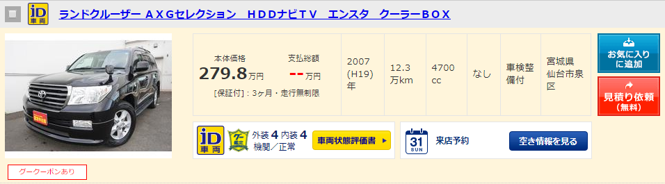 また、タイミングチェーン車なので10万km時の交換が原則不要であるため、もう少し走行距離が長いものを探せば、もっと安く購入することも可能です。
