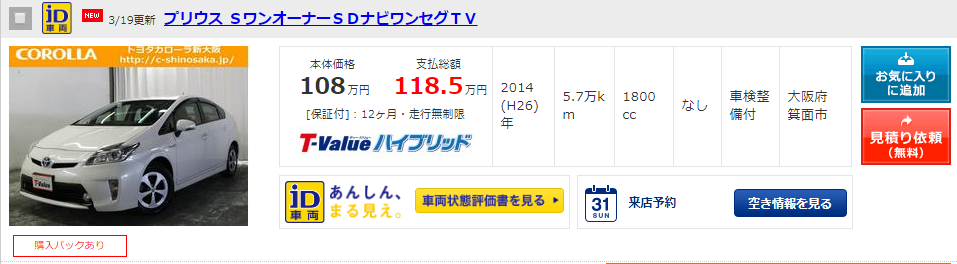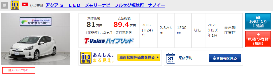 ただし、ガソリン車随一のエコカーという性質上、長く乗ることでお得感が増す車種であるため、新しめ中古車出物が「修復歴アリ」を除くとまだまだ少なく、新車価格とのふり幅も小さいため正直現行モデルなら新車購入したほうが、コスパ的に良いかもしれません。