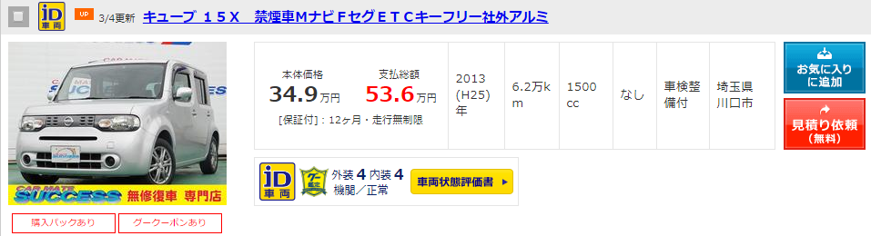 メモリナビやETCなどといった装備が充実し、禁煙車やワンオーナーなど付加価値がついていても、車体価格40万円以下の中古出物がゴロゴロしているので、予算と希望に合ったキューブを根気よく探してみましょう。