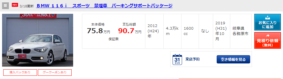 中古車相場的に見ても、世界的高級車ブランドBMWの車としてはお手頃で100万円以下で程度の良い1シリーズをゲット可能ですが、やはり車検代や修理代は割高ですので、あまりに安すぎるものは避けたほうが良いでしょう。