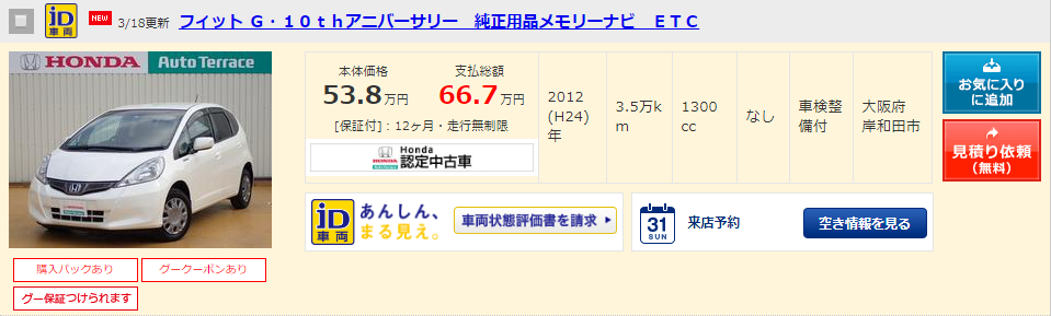 年式の割にあまり走っていない状態のいい中古車が60万円暖前半で購入でき、3ナンバー規格の同世代プリウスよりかなりお手頃価格なので、HVが初めてという方は維持費の安いフィットHVの方を狙ってみるのもアリです。