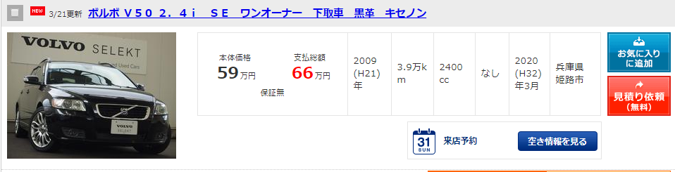 輸入車なので球数的には多くありませんが、S40・V50共に総額75~85万円出せば、ボルボならではの安全性と本革シートのリッチな質感を堪能することができます。
