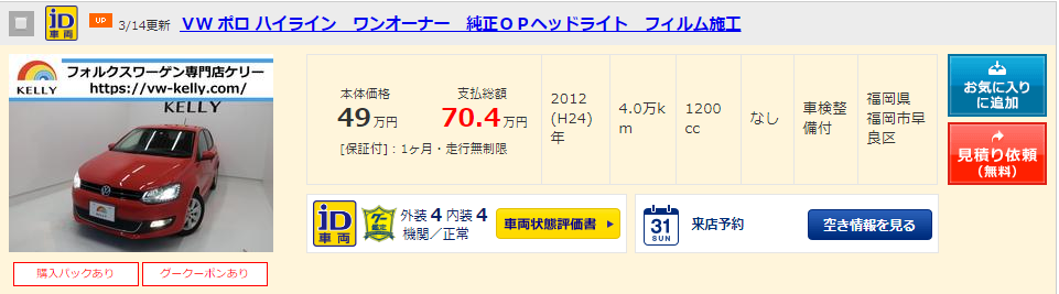 案外、日本の原風景ともマッチする5代目ポロは中古出物も多く、平均的には総額70~80万円あたりになりますが、グレードはもちろん地域によって相場が大きく異なるため、根気よくお買い得車を探しましょう。